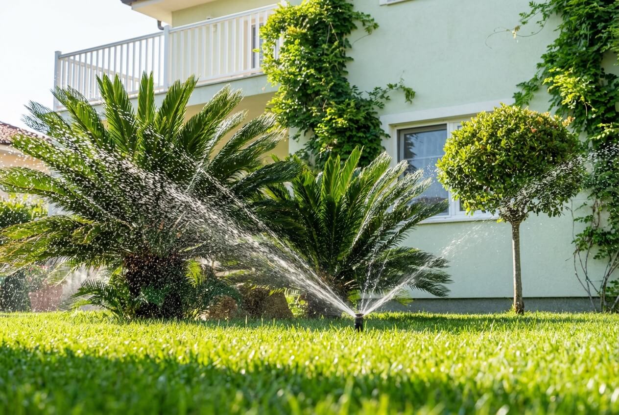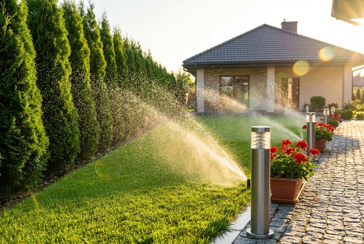 Рулонный газон, туи, клумбы требуют стабильного полива. Система подаёт нужный объём воды и помогает сохранить растения в жаркий сезон.