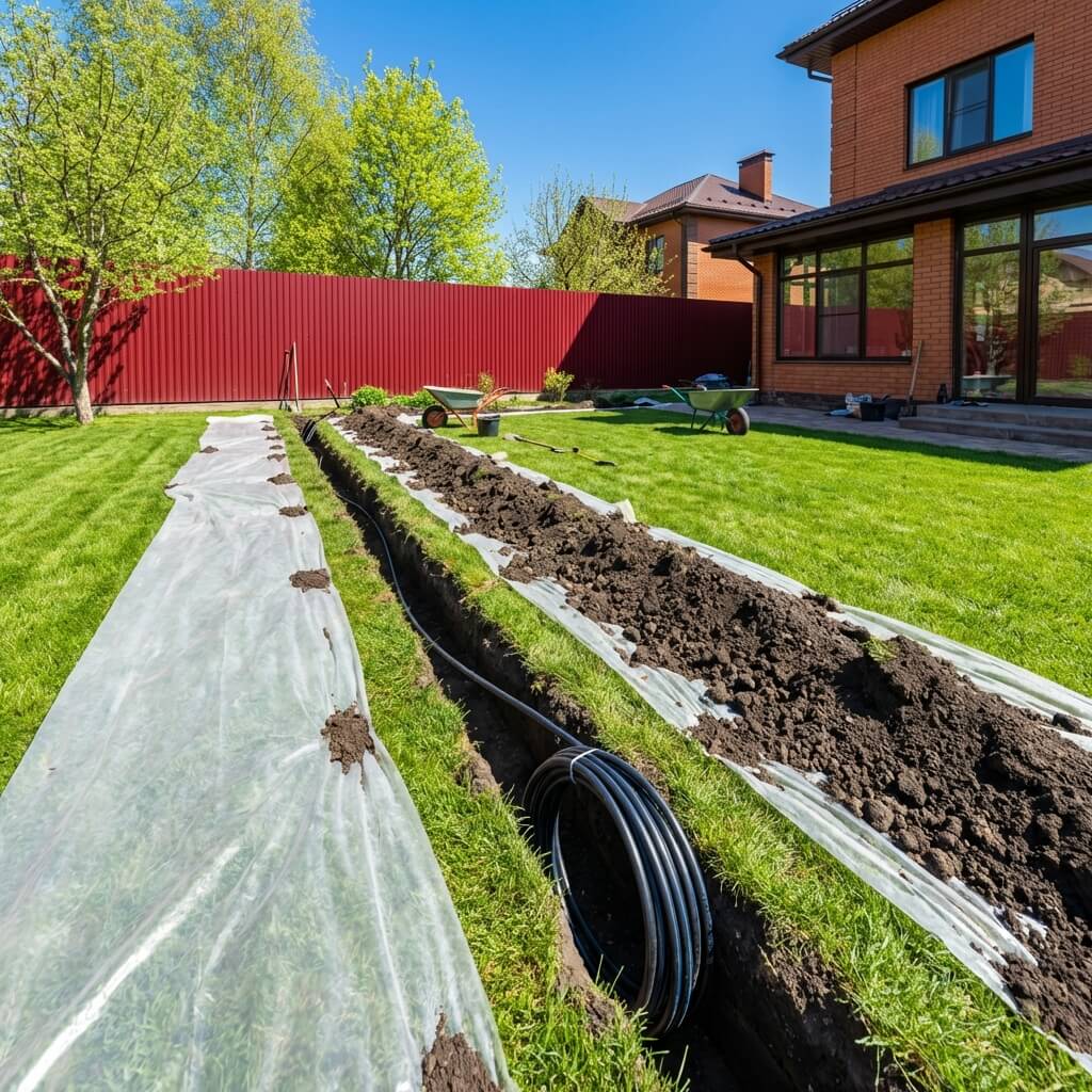 Копаем на защитную плёнку и аккуратно восстанавливаем участок. Газон и ландшафт остаются целыми — без «стройки» и мусора.